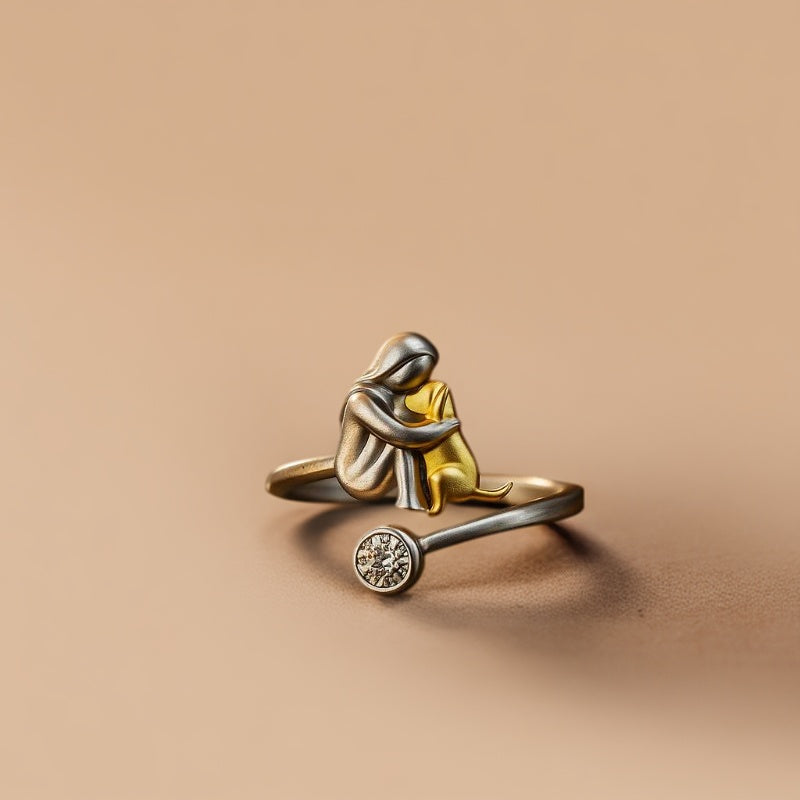 Capture the special bond you share with your furry best friend. This handcrafted sterling silver ring features a tender embrace between a woman and her beloved dog, artfully detailed in gleaming silver with golden accents. It's more than jewelry – it's a daily reminder of the unconditional love and joy your four-legged companion brings to your life.