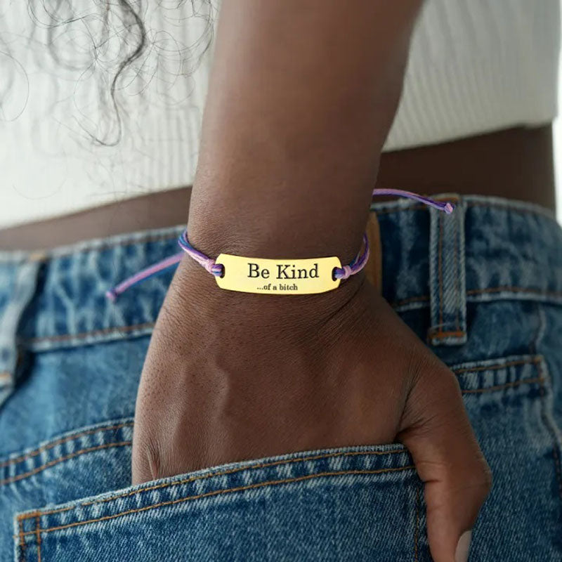 This fun-loving Engraved Bracelet offers a sneaky and tongue-in-cheek way to stay kind, even on your moodiest days. With a dainty, simple ring band and cheeky engravings on the bar, this bracelet is sure to put a smile on your face. ❤️🎁