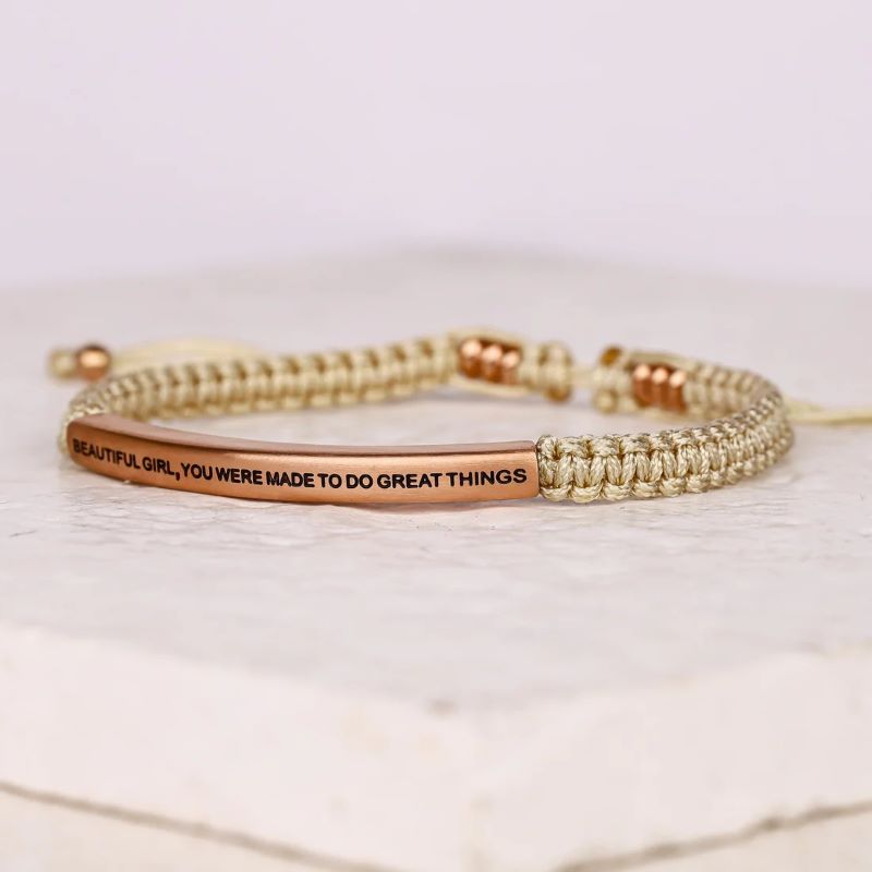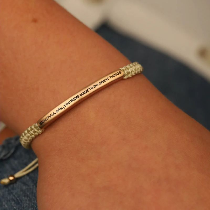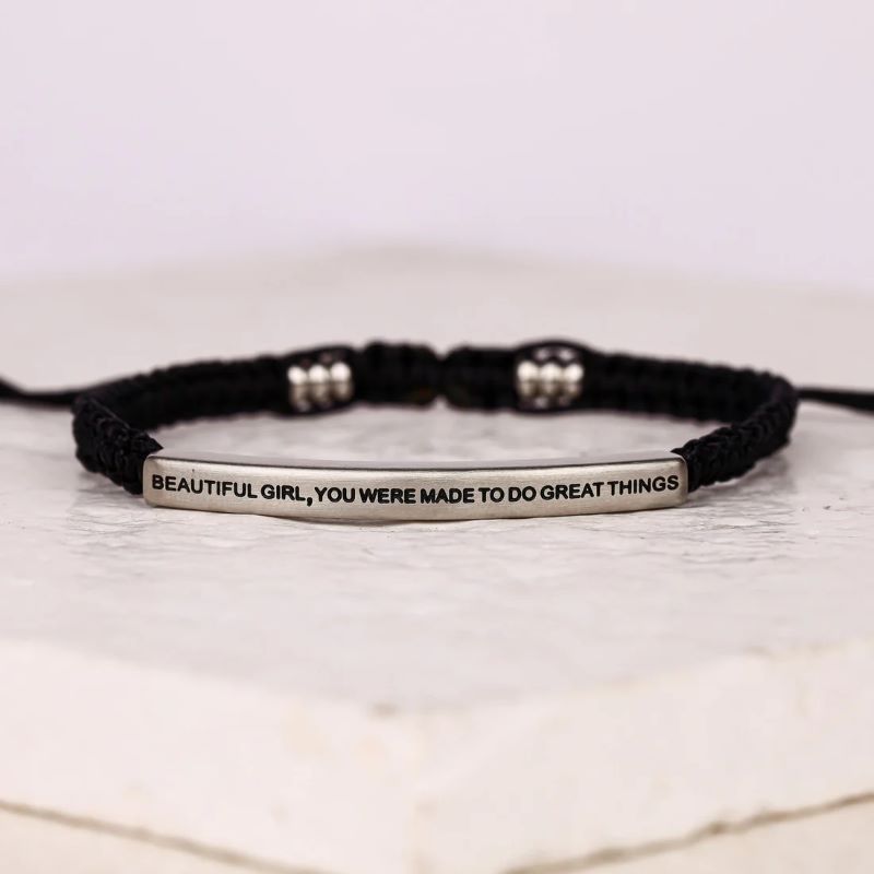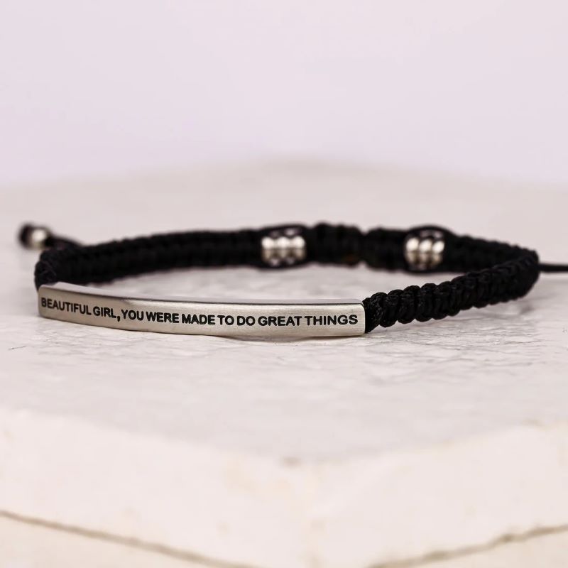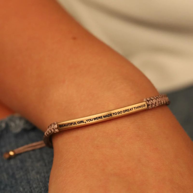When you feel doubt and fear, look down at your bracelet and remember BEAUTIFUL GIRL, YOU WERE MADE TO DO GREAT THINGS.