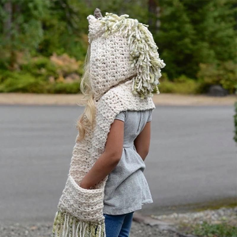 🦄 The Crochet Cartoon Unicorn Winter Hat with Scarf Pocket Hooded Knitting is a perfect unicorn gift, keeping lovely and warm with its 3-in-1 design while also serving as the finishing touch to any unicorn costume.