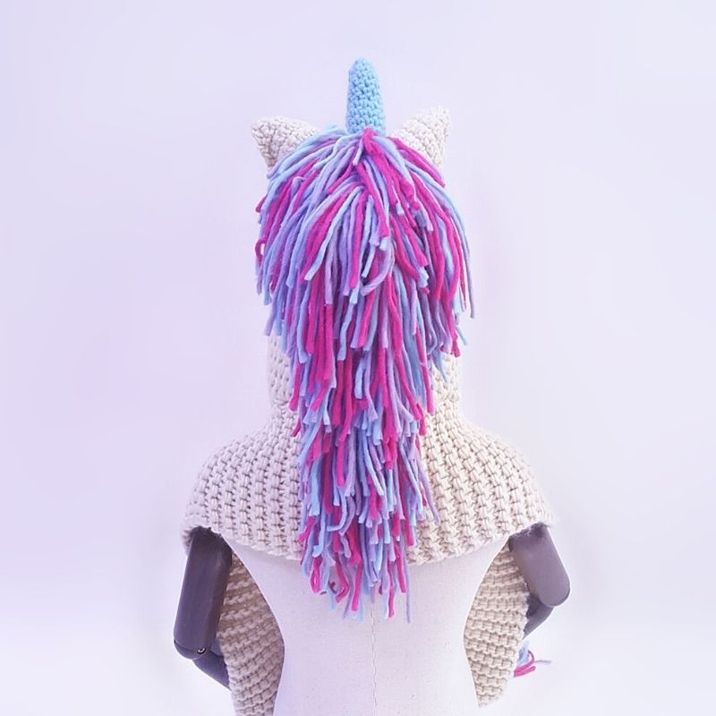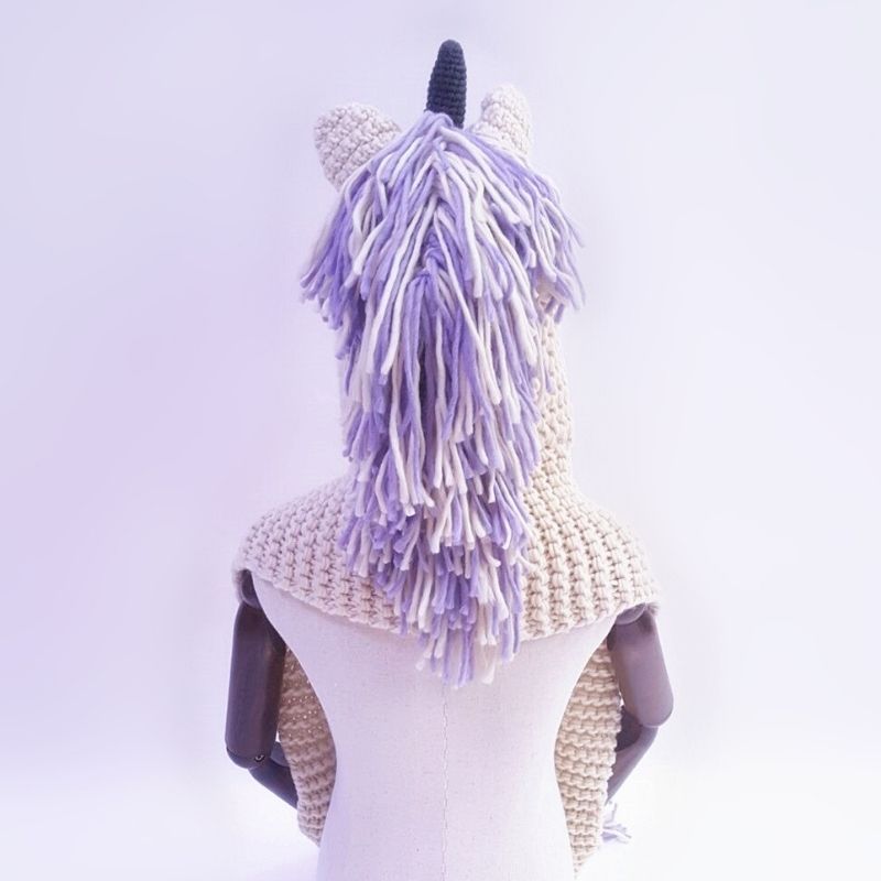 Design: Adorable cable knitted unicorn hood hat, with horns and tassel