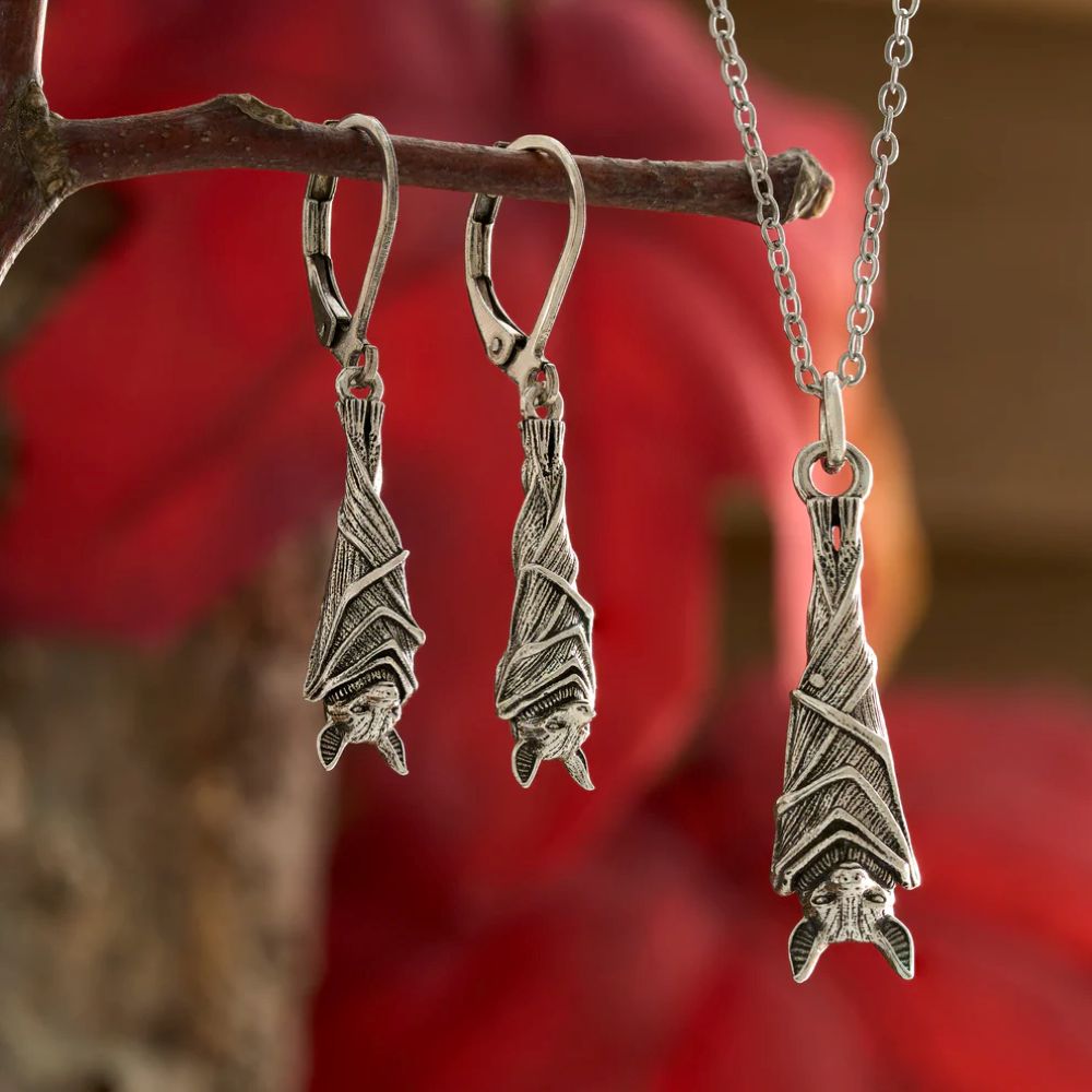 The set includes finely detailed bats crafted from brass and plated in vintage silver for a rustic yet refined finish. The earrings measure 23.0mm x 6.5mm and hang from secure surgical stainless steel leverback hooks—lightweight, durable, and comfortable for sensitive ears. The matching necklace features a 31.0mm x 8.5mm bat pendant suspended from an 18" stainless steel chain with a 2" extender for the perfect fit. Together, these pieces create a cohesive, eye-catching set that works beautifully for Halloween festivities or as a year-round statement of mystical charm.
