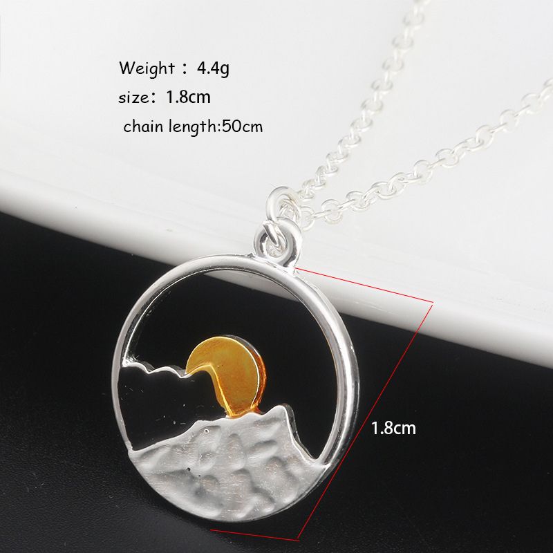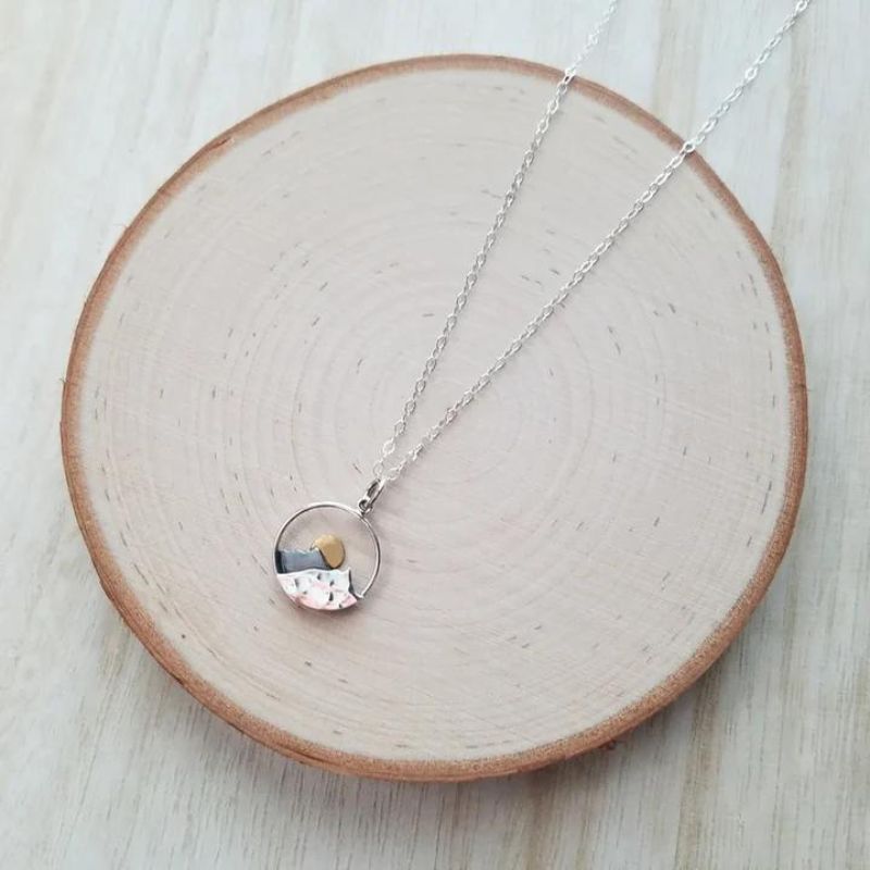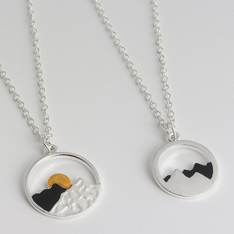 Inspired from our love of nature, this mountain necklace will remind you of your favorite place. Layers of durable alloy mountains with a glowing sun peeking out.
